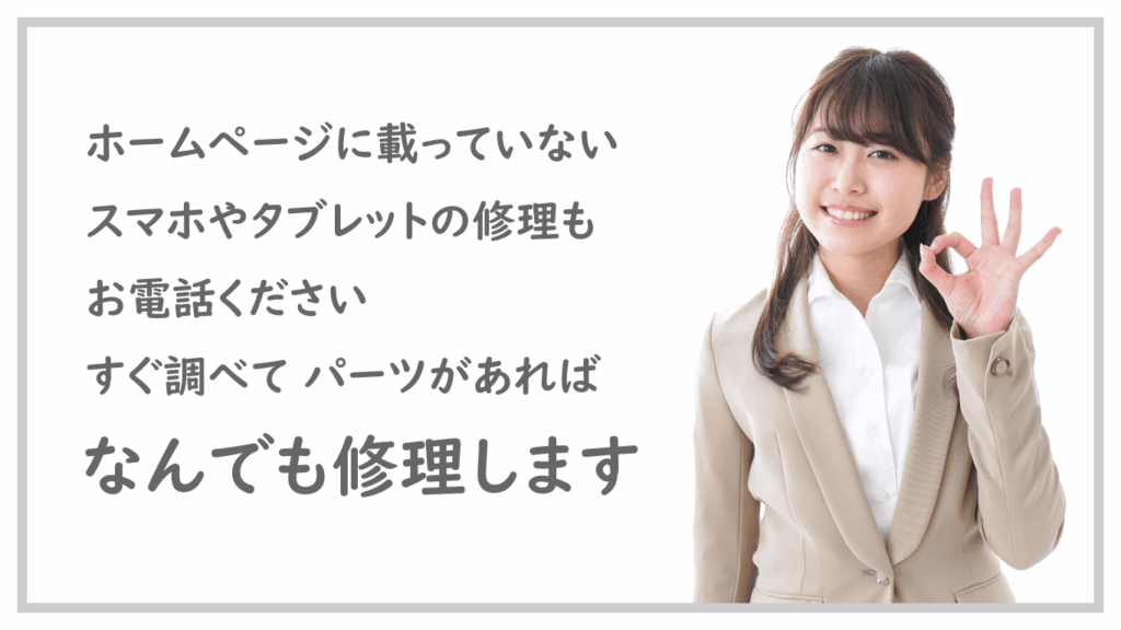 ホームページに修理内容や価格が載っていなくても、お電話やホームページなどからご相談いただけますとすぐにご回答させていただきます。スマートフォンは、たくさんの機種やモデルがありますので、お客様が使用しているスマートフォンの型番やお困りの症状を教えていただけますと幸いです。