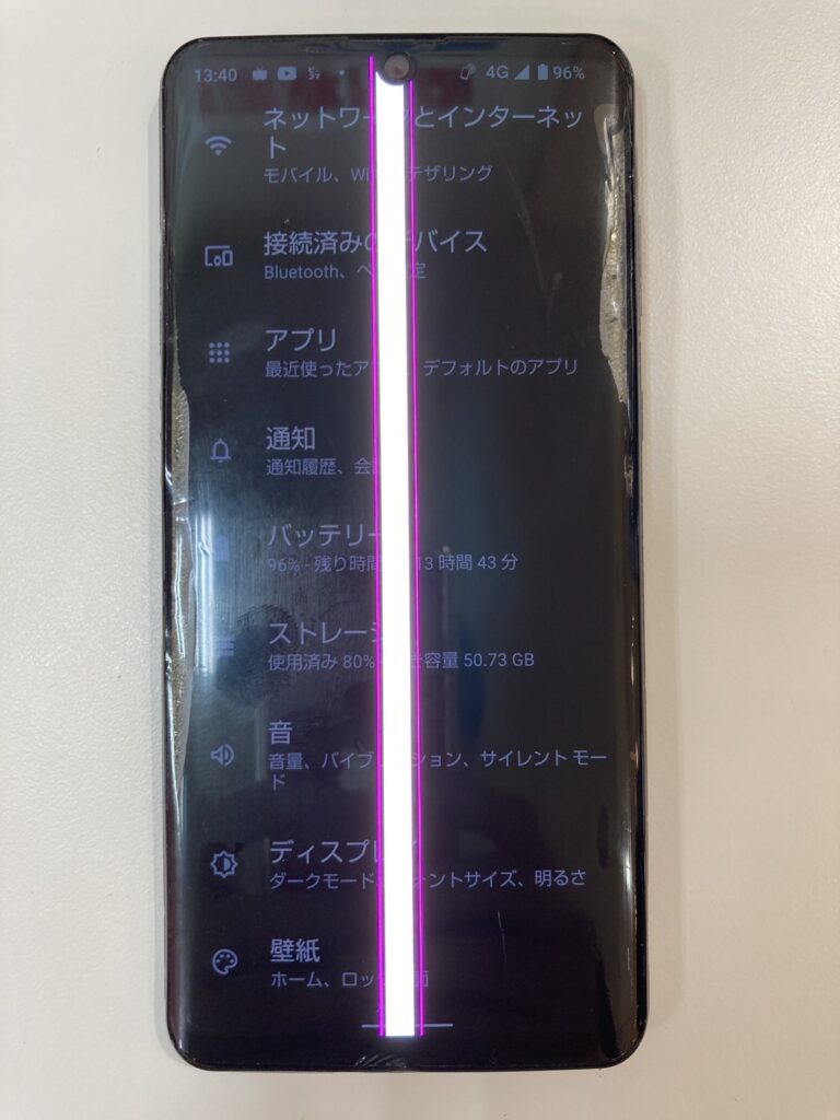 症状:画面中央にピンクと白の線がある。再起動しても消える事はなくそのまま。