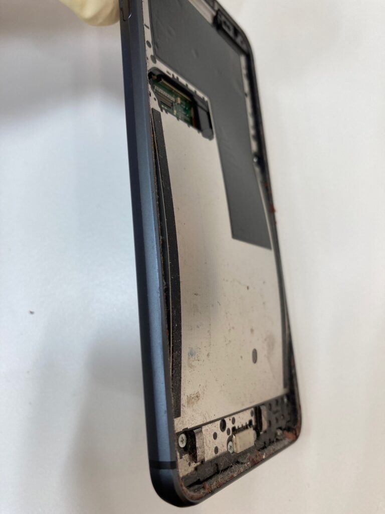 症状:画面が本体から外れている。バッテリーは膨張し、基板などを保護するプレートを押し上げ曲げている。