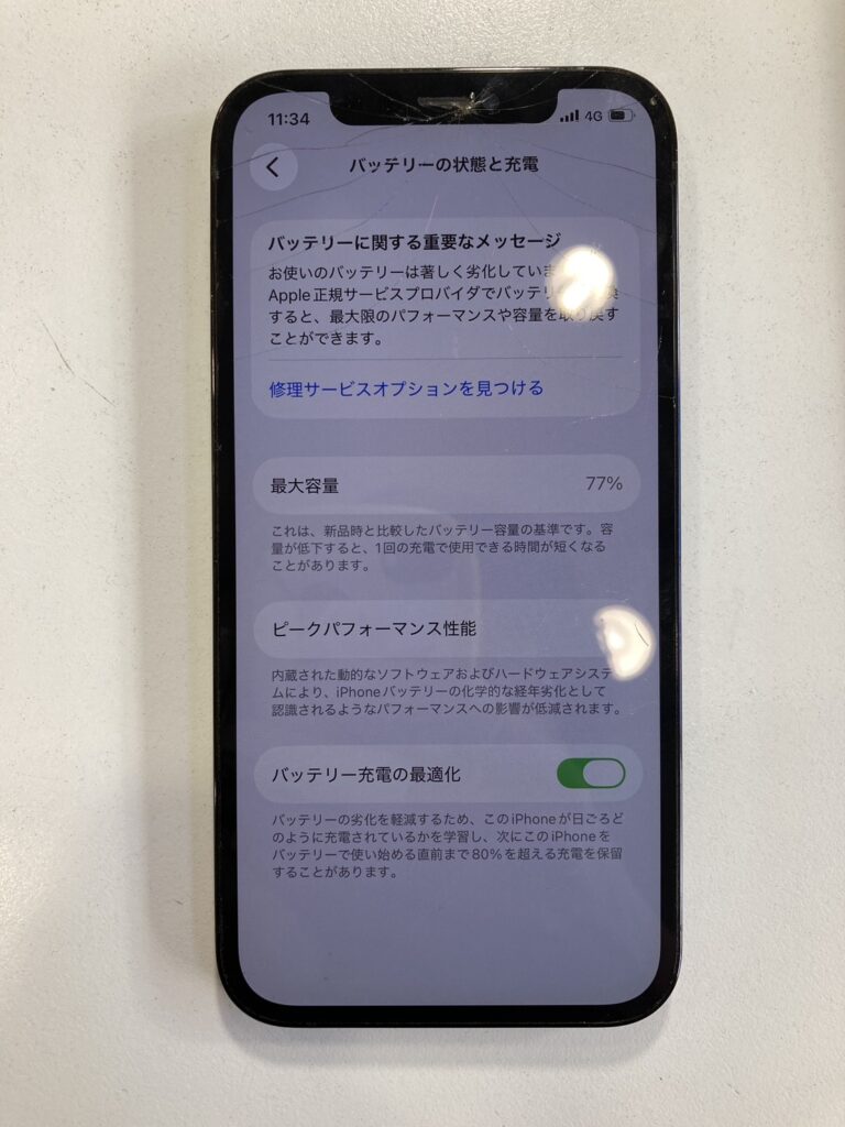 今回は、画面交換と併せてバッテリー交換も行いました。バッテリー交換は定期的に交換していただきたいもので、バッテリー最大容量が80%を下回ったり、減りが早いと感じたりしたときに交換するのが良いでしょう。そして、バッテリー交換前のメッセージを見てみますと、「お使いのバッテリーは著しく劣化しています」というメッセージがありますね。