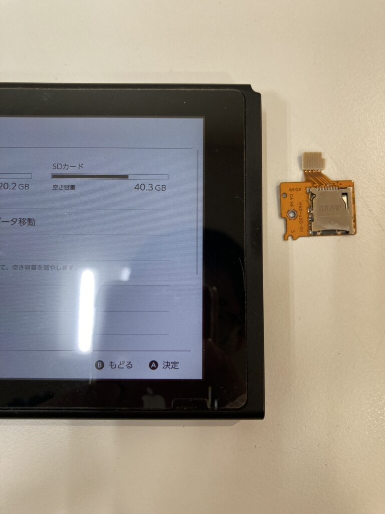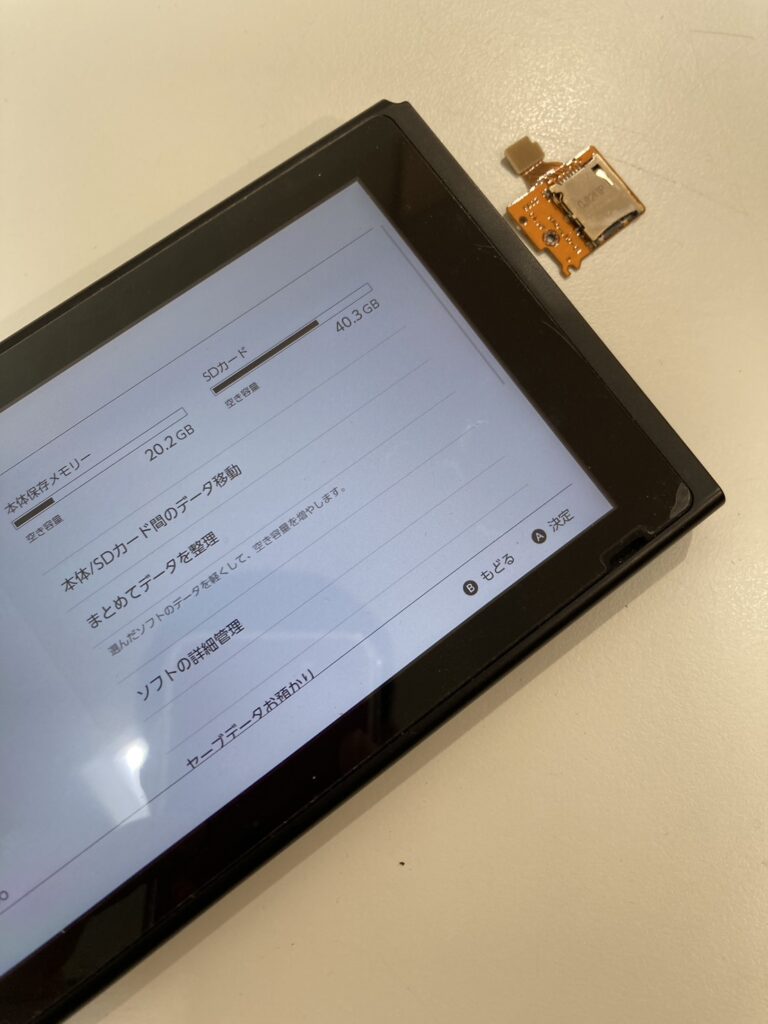 Nintendo SwitchでSDカードにアクセスできない原因は、いろいろ考えられます。SDカードの接触不良・SDカード自体が壊れている・SDカードを読み込むパーツの破損・SDカードを読み込むパーツを接続する基板の故障などです。